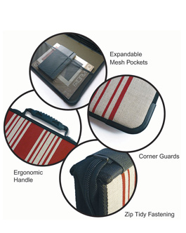 A unique range of canvas covered portfolios using vintage deckchair stripe and floral patterns.